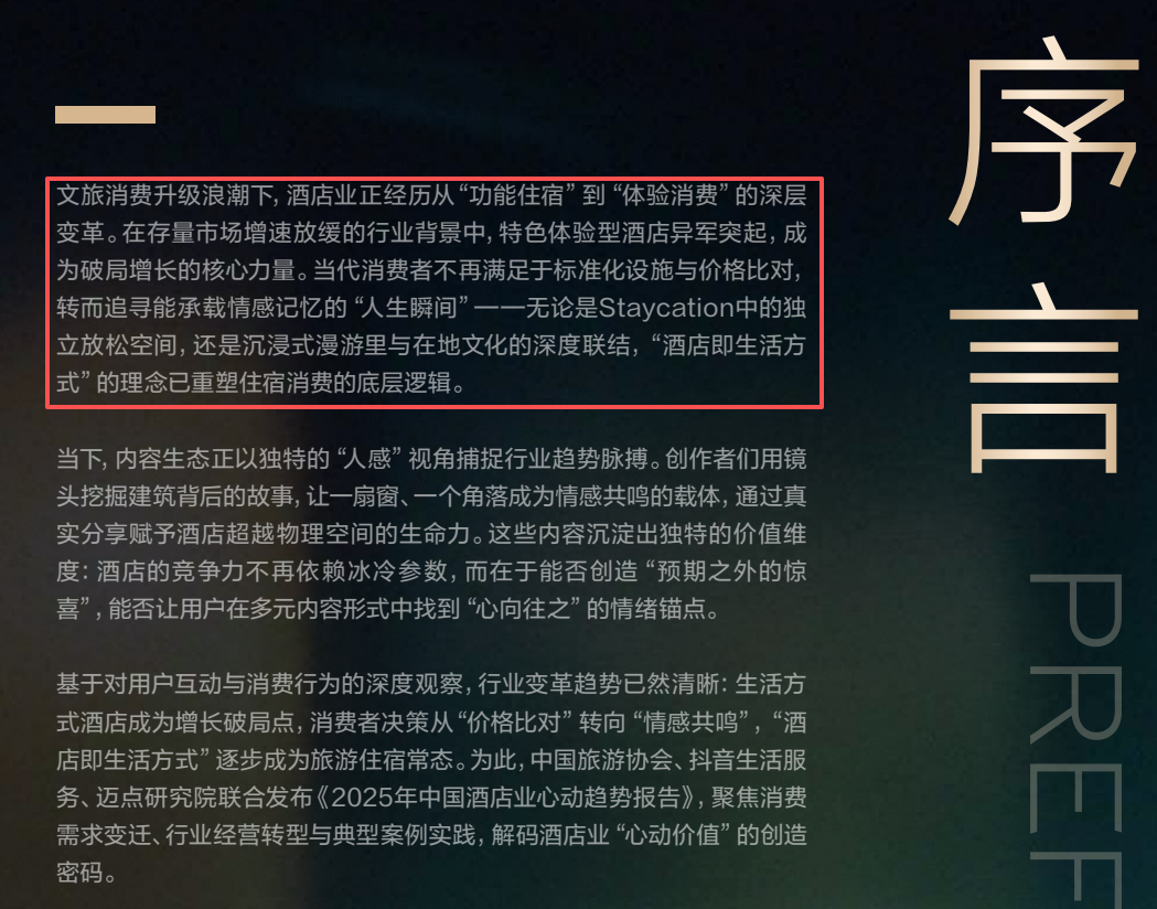 抖音生活服务联合中国旅游协会、迈点研究院发布的《2025年心动酒店趋势报告》,在序言中描述了这样一个趋势:文旅消费升级浪潮下,酒店业正经历从“功能住宿”到“体验消费”的深层变革。在存量市场增速放缓的行业背景中,特色体验型酒店异军突起,成为破局增长的核心力量。当代消费者不再满足于标准化设施与价格比对,转而追寻能承载情感记忆的“人生瞬间”--无论是Staycation中的独立放松空间,还是沉浸式漫游里与在地文化的深度联结,“酒店即生活方式”的理念已重塑住宿消费的底层逻辑。