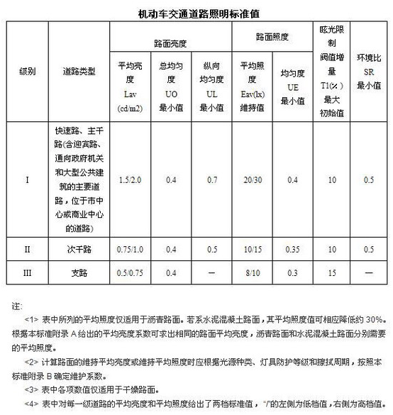 根据《城市道路照明设计标准》规范中第3.3.1款,设置连续照明的机动车交通道路的照明标准值应符合下表的规定